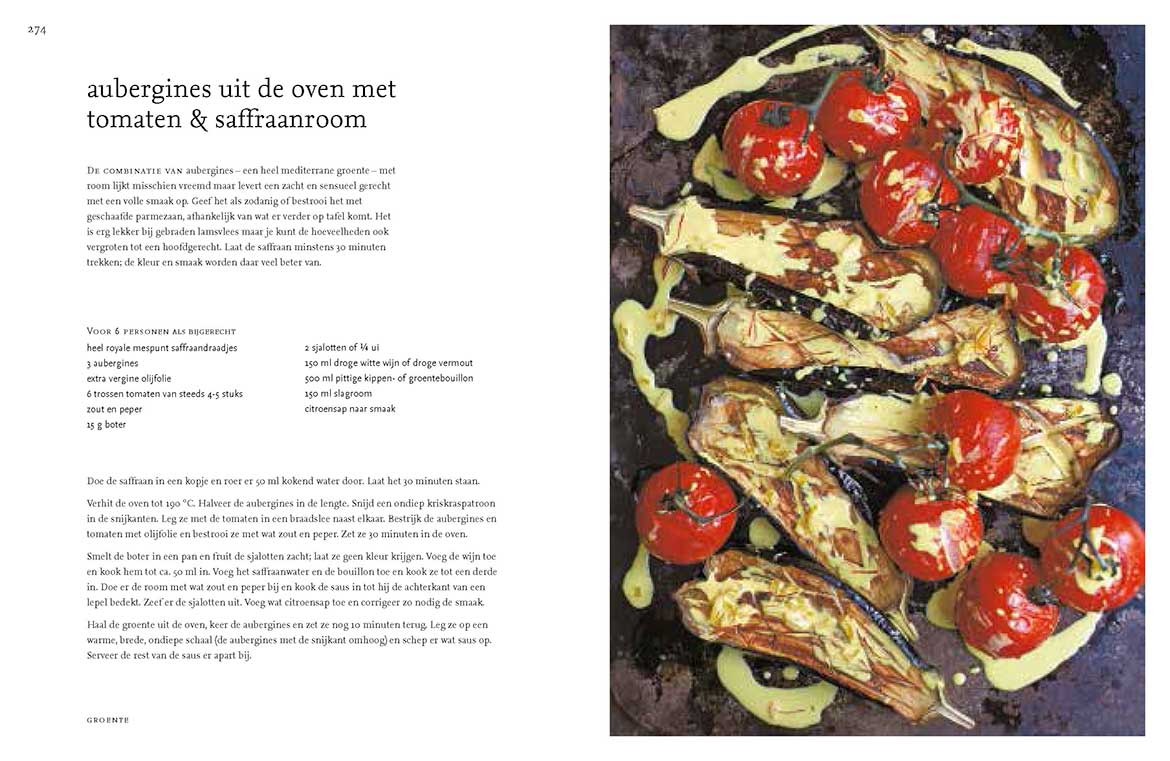 Over dit recept schrijft ze: “De combinatie van aubergines – een heel mediterrane groente – met room lijkt misschien vreemd maar levert een zacht en sensueel gerecht met een volle smaak op. Geef het als zodanig of bestrooi het met geschaafde parmezaan, afhankelijk van wat er verder op tafel komt. Het is erg lekker bij gebraden lamsvlees maar je kunt de hoeveelheden ook vergroten tot een hoofdgerecht. Laat de saffraan minstens 30 minuten trekken; de kleur en smaak worden daar veel beter van.”