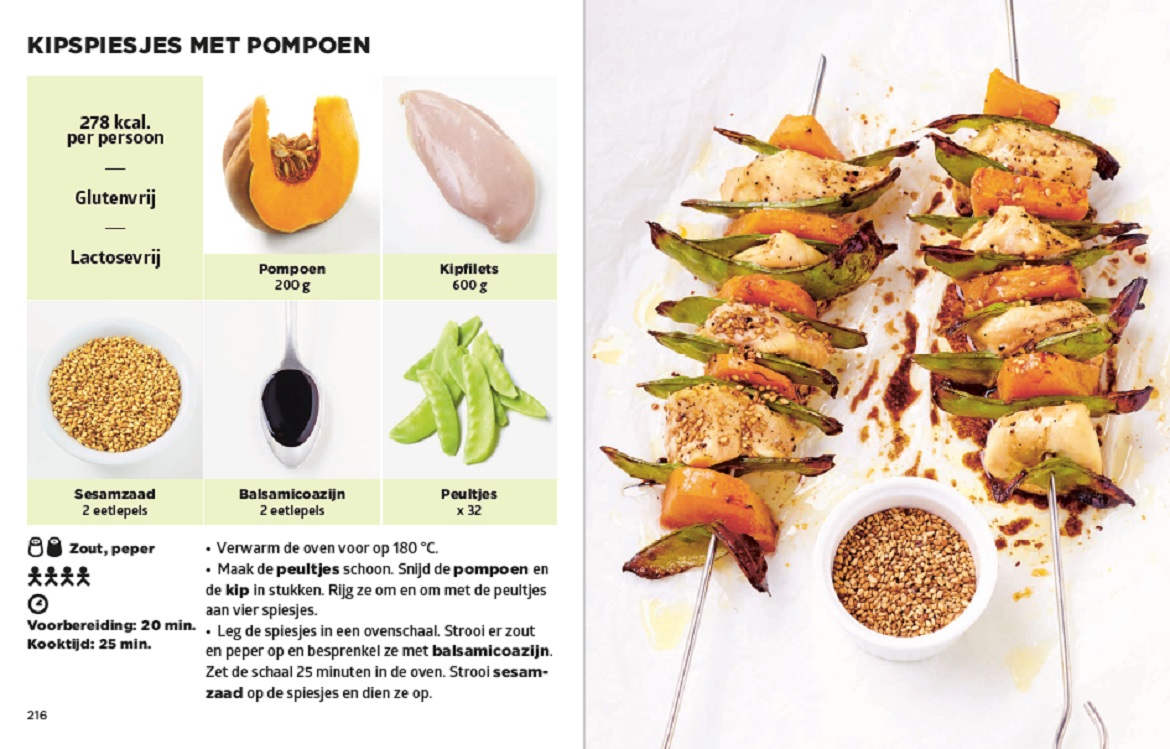 Het recept voor deze kipspiesjes met pompoen en peultjes komt uit Het allermakkelijkste kookboek ter wereld light van chef-kok en (food)fotograaf Jean-François Mallet.