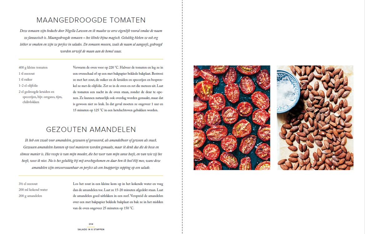 Over het recept schrijft ze: “Deze tomaten zijn bedacht door Nigella Lawson en ik maakte ze eerst eigenlijk vooral omdat de naam zo fantastisch is. Maangedroogde tomaten – het klinkt bijna magisch. Gelukkig bleken ze ook erg lekker te smaken en zijn ze perfect in salades. De tomaten moeten, zoals de naam al aangeeft, gedroogd worden terwijl de maan aan de hemel staat.”