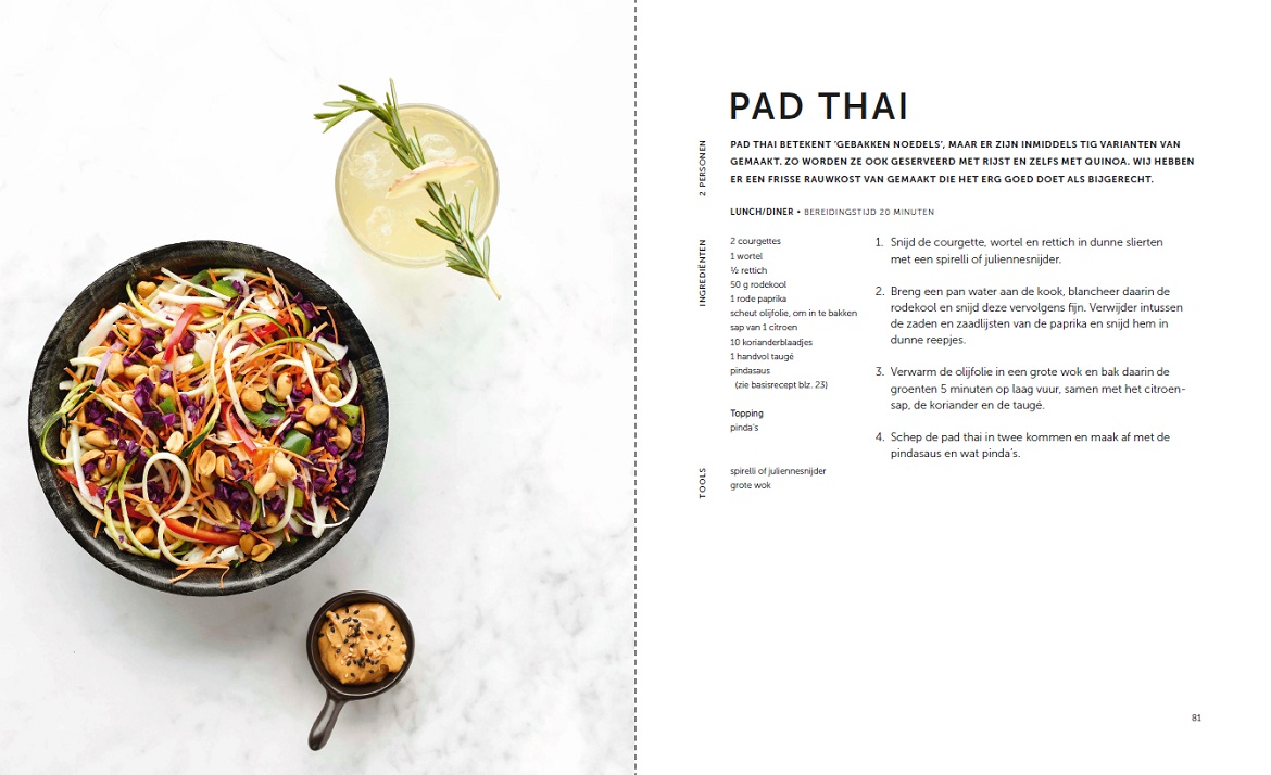 Over het gerecht schrijft ze: “Pad thai betekent ‘gebakken noedels’, maar er zijn inmiddels tig varianten van gemaakt. Zo worden ze ook geserveerd met rijst en zelfs met quinoa. Wij hebben er een frisse rauwkost van gemaakt die het erg goed doet als bijgerecht.”