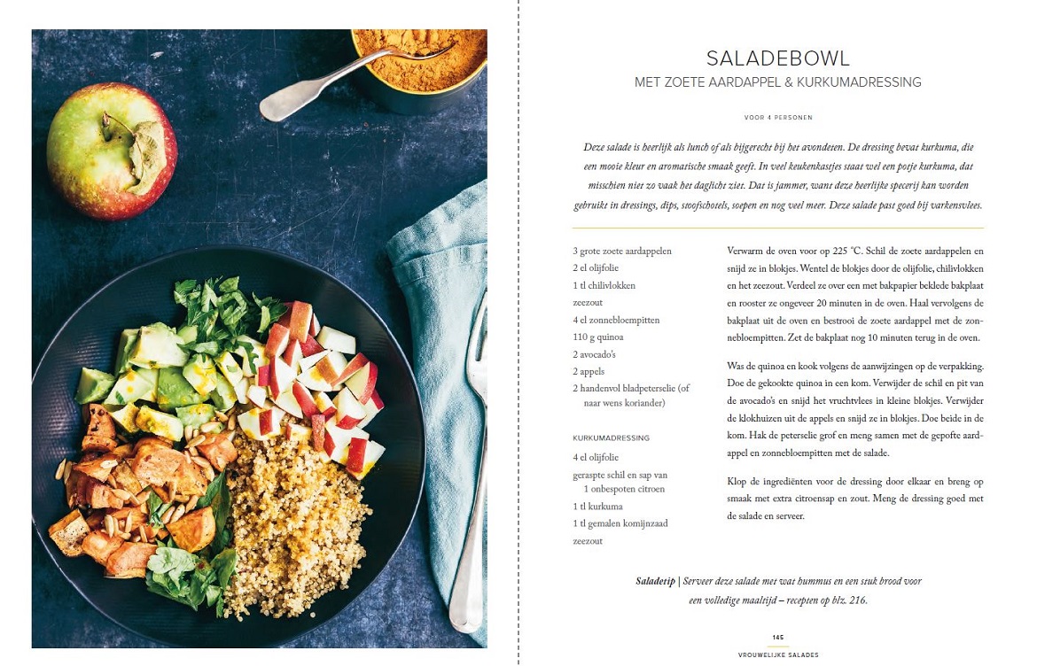 Over het recept schrijft ze: “Deze salade is heerlijk als lunch of als bijgerecht bij het avondeten. De dressing bevat kurkuma, die een mooie kleur en aromatische smaak geeft. In veel keukenkastjes staat wel een potje kurkuma, dat misschien niet zo vaak het daglicht ziet. Dat is jammer, want deze heerlijke specerij kan worden gebruikt in dressings, dips, stoofschotels, soepen en nog veel meer. Deze salade past goed bij varkensvlees.”