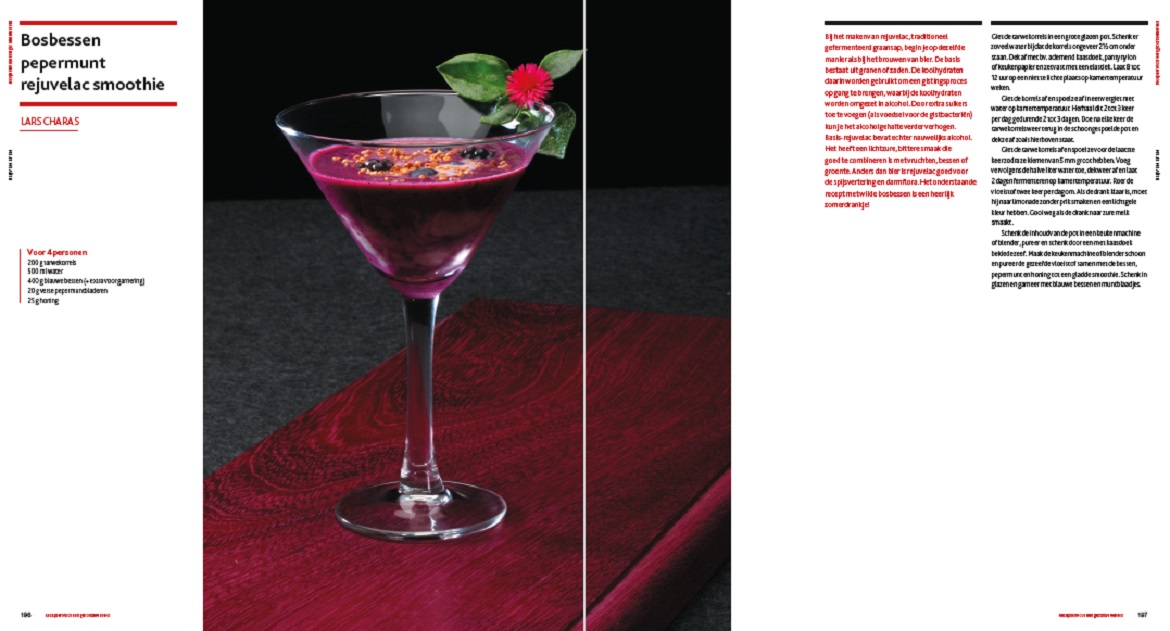 Hij schrijft erover: “Bij het maken van rejuvelac, traditioneel gefermenteerd graansap, begin je op dezelfde manier als bij het brouwen van bier. De basis bestaat uit granen of zaden. De koolhydraten daarin worden gebruikt om een gistingsproces op gang te brengen, waarbij de koolhydraten worden omgezet in alcohol. Door extra suikers toe te voegen (als voedsel voor de gistbacteriën) kun je het alcoholgehalte verder verhogen. Basis-rejuvelac bevat echter nauwelijks alcohol. Het heeft een lichtzure, bittere smaak die goed te combineren is met vruchten, bessen of groente. Anders dan bier is rejuvelac goed voor de spijsvertering en darmflora. Het onderstaande recept met wilde bosbessen is een heerlijk zomerdrankje! “
