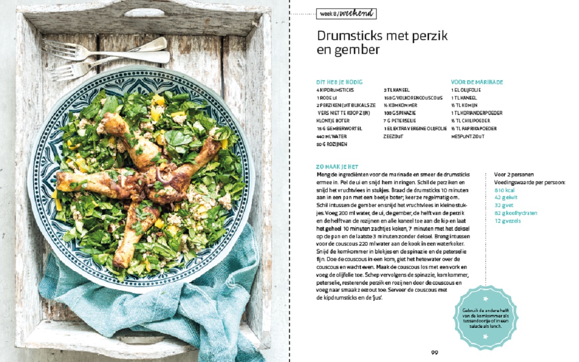 Het recept voor deze drumsticks met perzik en gember komt uit het boek Voedzaam & Snel Gezonde weekmenu’s van Jennifer & Sven.