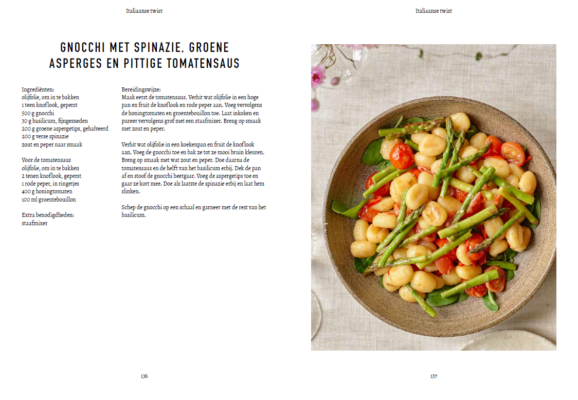 Het recept voor deze gnocchi met spinazie, groene asperges en pittige tomatensaus komt uit het kookboek Groente menu’s van Niven Kunz en Virginie van Bronckhorst-Kunz. In dit boek vind je de leukste voor-, hoofd-, en nagerechten voor etentjes thuis met sterrentouch. Verrassend makkelijk en bijzonder tegelijk. Niet vega (kan wel), wel met groenten als de absolute ster.