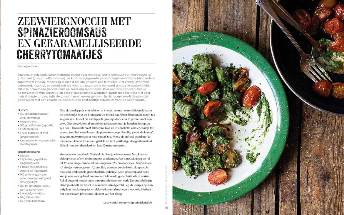 Het recept voor deze gnocchi met zeewier in spinazie roomsaus komt uit het boek Groente uit zee van Lisette Kreischer, Stichting Noordzeeboerderij en Marcel Schuttelaar. Het kookboek bevat informatie over zeewier en algen en 50 heerlijke en verrassende recepten.