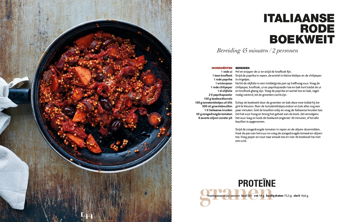 Het recept voor deze Italiaanse rode boekweit komt uit het boek Fit vega(n) food van (o.a.) voedingsdeskundige en orthomoleculair therapeut Nanneke Schreurs en foodfotograaf José van Riele.