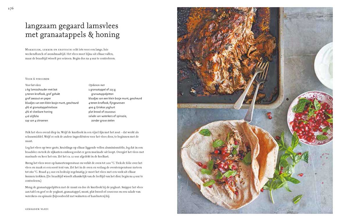 Over dit recept schrijft ze: “Makkelijk, lekker en exotisch: echt iets voor een lange, luie weekendlunch of avondmaaltijd. Het vlees moet bijna uit elkaar vallen, maar de braadtijd wisselt per seizoen. Begin dus na 4 uur te controleren.”