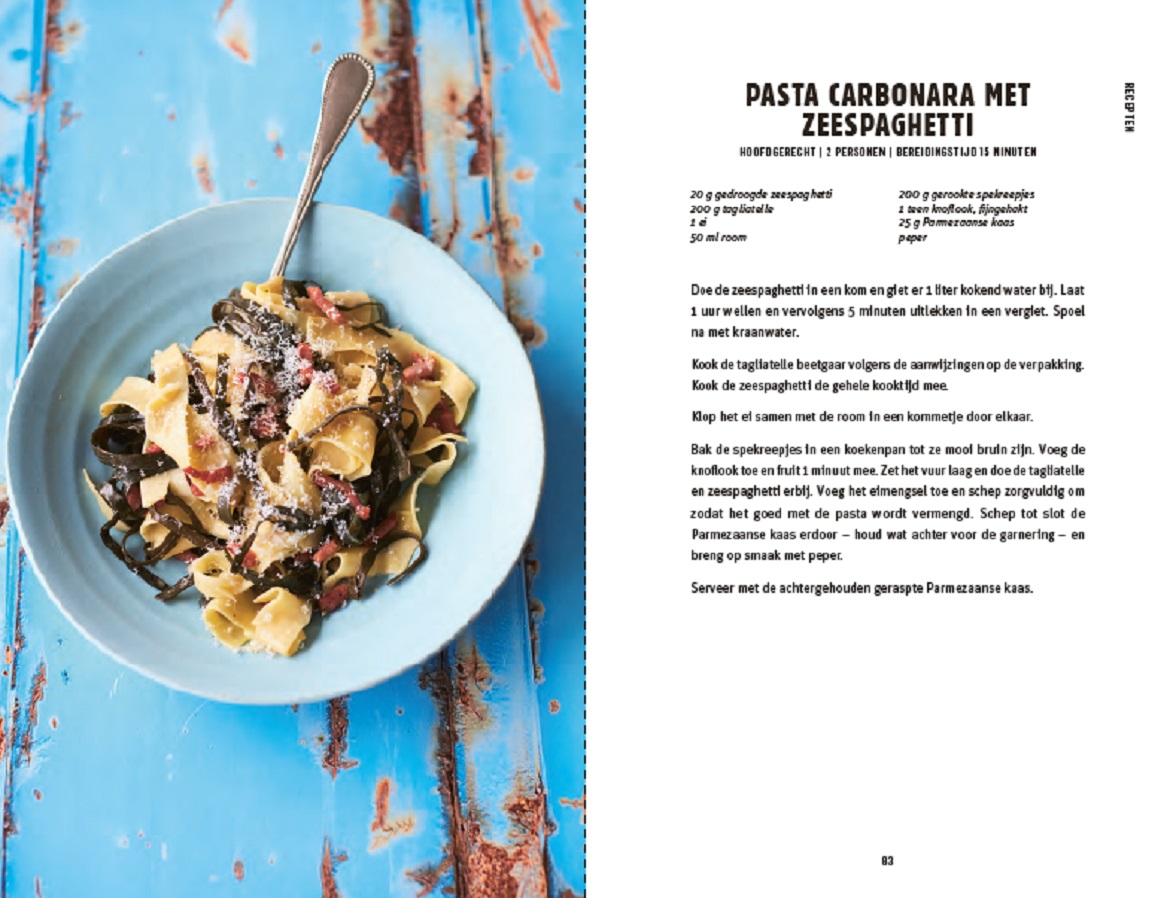 Het recept voor deze pasta carbonara met zeespaghetti komt uit het boek Koken met zeewier en zilte groente van ‘Toine de Zeewierman’ Toine Wilke.