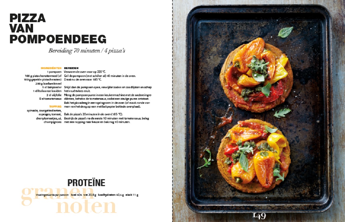 Het recept voor deze pizza van pompoendeeg komt uit het boek Fit vega(n) food van (o.a.) voedingsdeskundige en orthomoleculair therapeut Nanneke Schreurs en foodfotograaf José van Riele.