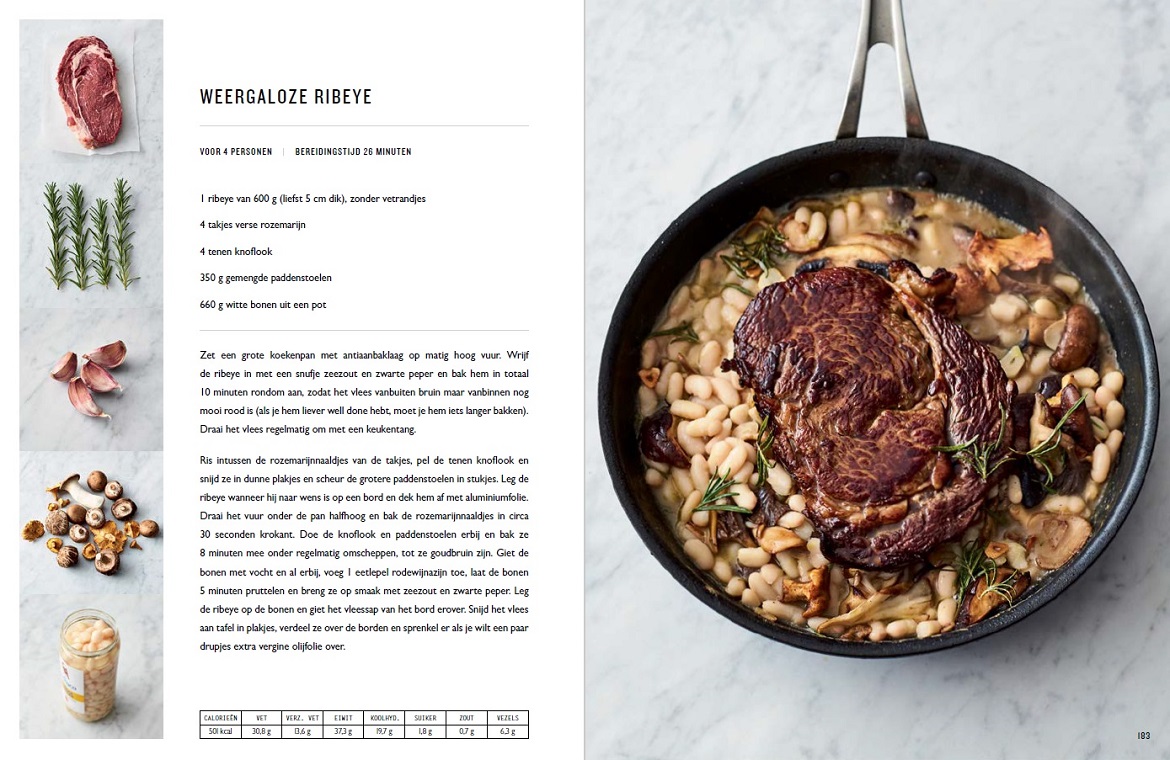 Het recept voor deze weergaloze ribeye met paddenstoelen en witte bonen komt uit het boek 5 ingrediënten van Jamie Oliver.