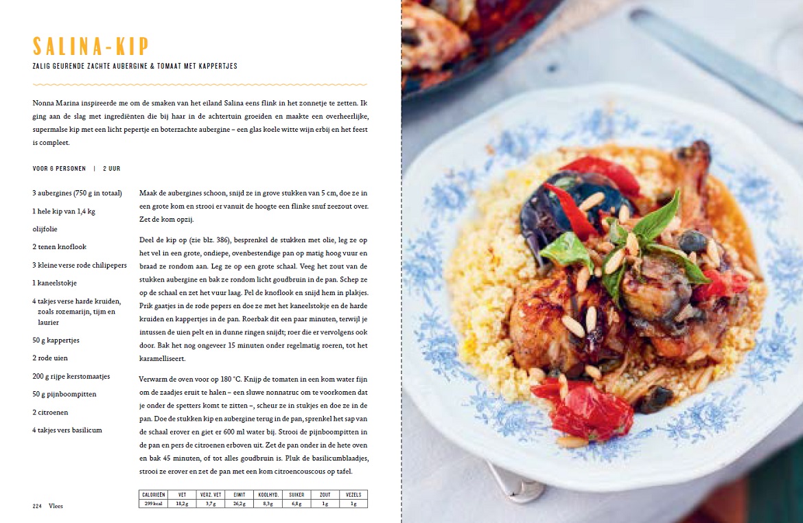 Hij schrijft erover: “Nonna Marina inspireerde me om de smaken van het eiland Salina eens flink in het zonnetje te zetten. Ik ging aan de slag met ingrediënten die bij haar in de achtertuin groeiden en maakte een overheerlijke, supermalse kip met een licht pepertje en boterzachte aubergine – een glas koele witte wijn erbij en het feest is compleet.”