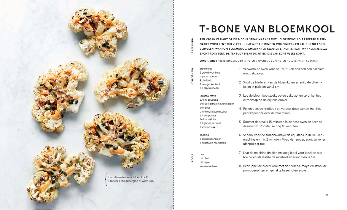 Over dit recept in het boek: “Een vegan variant op de T-bone steak maak je met… bloemkool! Dit lekkere alternatief voor een stuk vlees kun je met tig dingen combineren en zal dus niet snel vervelen. Waarom bloemkool? Amerikanen kwamen erachter dat, wanneer je deze zacht roostert, de textuur bizar dicht bij die van echt vlees komt.”