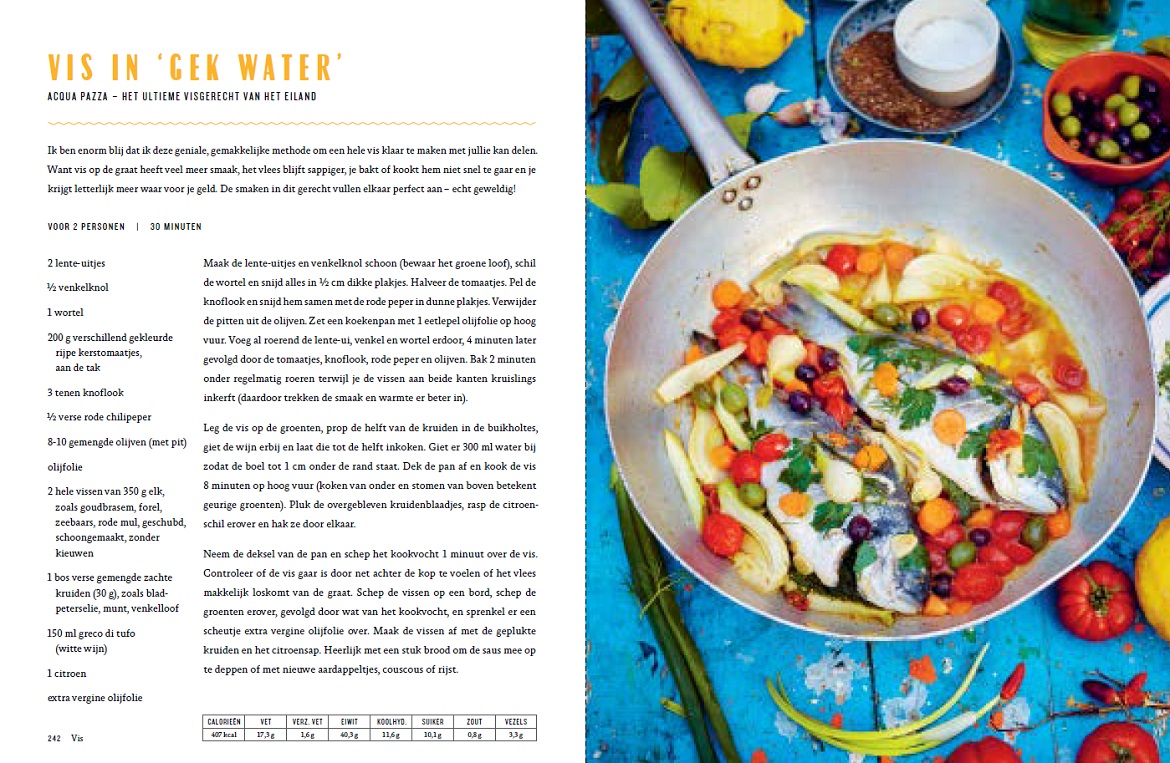 Het recept voor deze vis in ‘gek water’ (acqua pazza, het ultieme visgerecht van het eiland) komt uit het kookboek Jamie kookt Italië van Jamie Oliver.