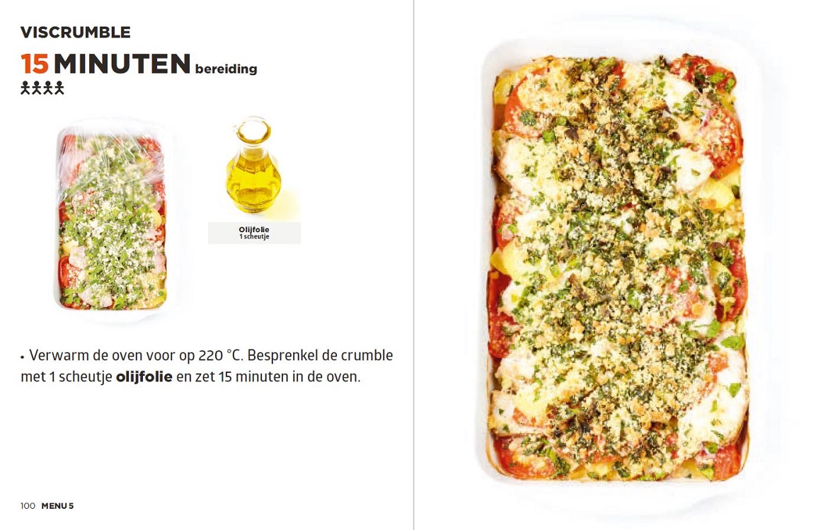 - BEREIDING | Verwarm de oven voor op 220 °C. Besprenkel de crumble met 1 scheutje olijfolie en zet 15 minuten in de oven.