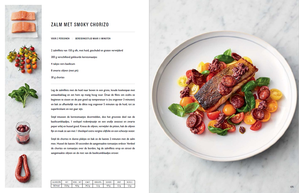 Het recept voor deze zalm met chorizo en kerstomaatjes komt uit het boek 5 ingrediënten van Jamie Oliver.
