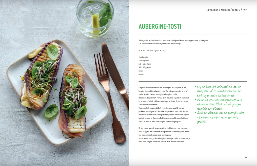 Uit het boek over dit recept: ‘Wist je dat je het brood in een tosti heel goed kunt vervangen door aubergine? De tosti wordt dan koolhydraatarm én vezelrijk.’