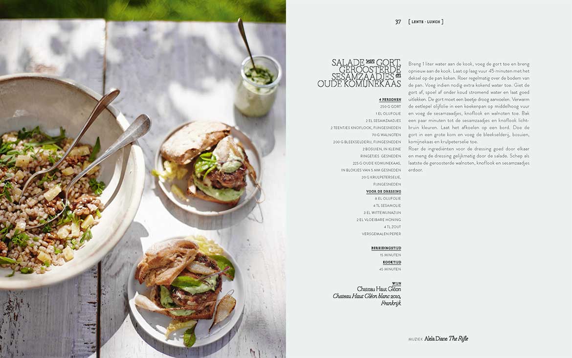 Een heerlijk gerecht voor in de lente, deze gort salade! Lekker voedzaam, met geroosterde sesamzaadjes, bleekselderij en oude komijnekaas en een heerlijk frisse dressing. Bekijk ook de muziek- en wijntip hieronder om van je lunch een echt feestje te maken.