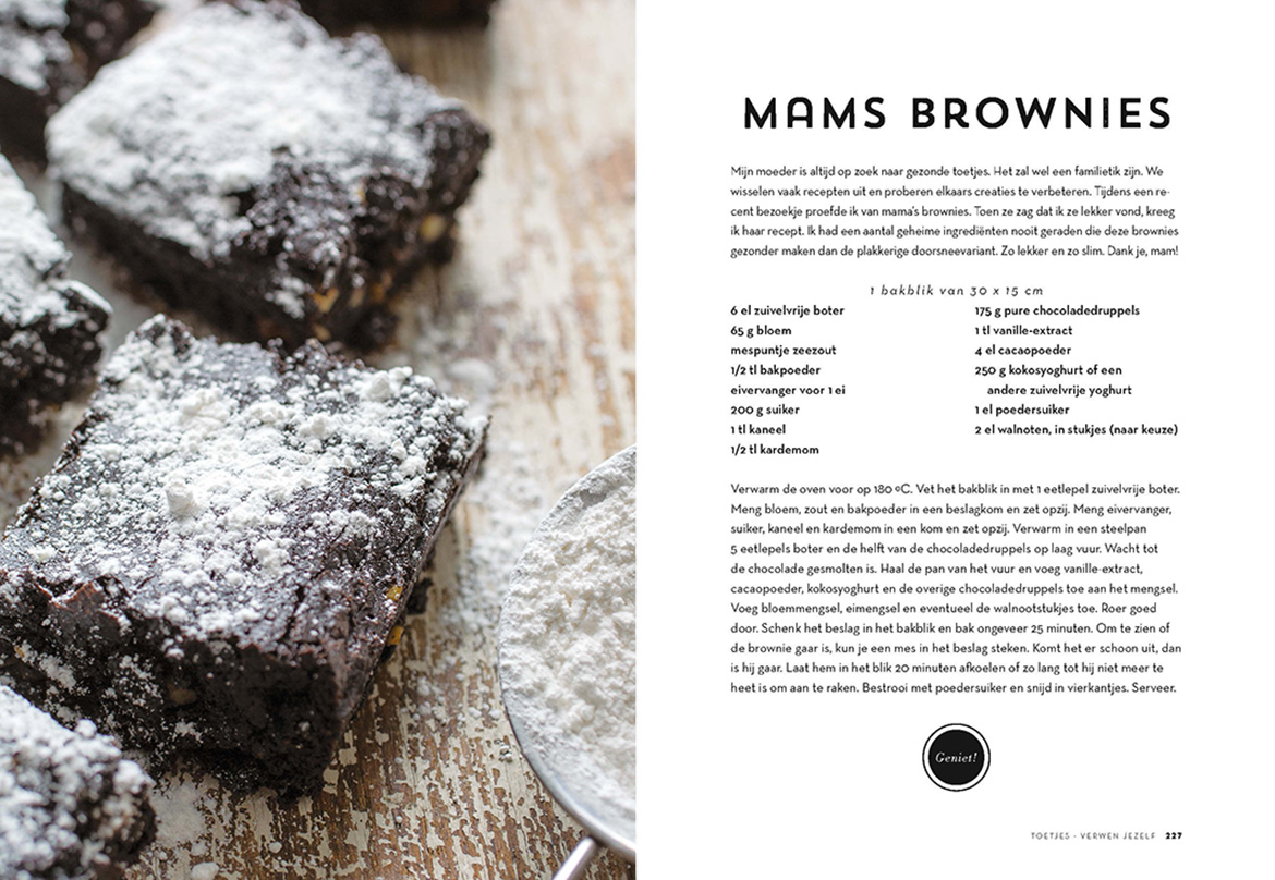 Dit recept voor brownies komt uit het Tara Stiles kookboek. Tara over dit recept: “Mijn moeder is altijd op zoek naar gezonde toetjes. Het zal wel een familietik zijn. We wisselen vaak recepten uit en proberen elkaars creaties te verbeteren. Tijdens een recent bezoekje proefde ik van mama’s brownies. Toen ze zag dat ik ze lekker vond, kreeg ik haar recept. Ik had een aantal geheime ingrediënten nooit geraden die deze brownies gezonder maken dan de plakkerige doorsneevariant. Zo lekker en zo slim. Dank je, mam!”