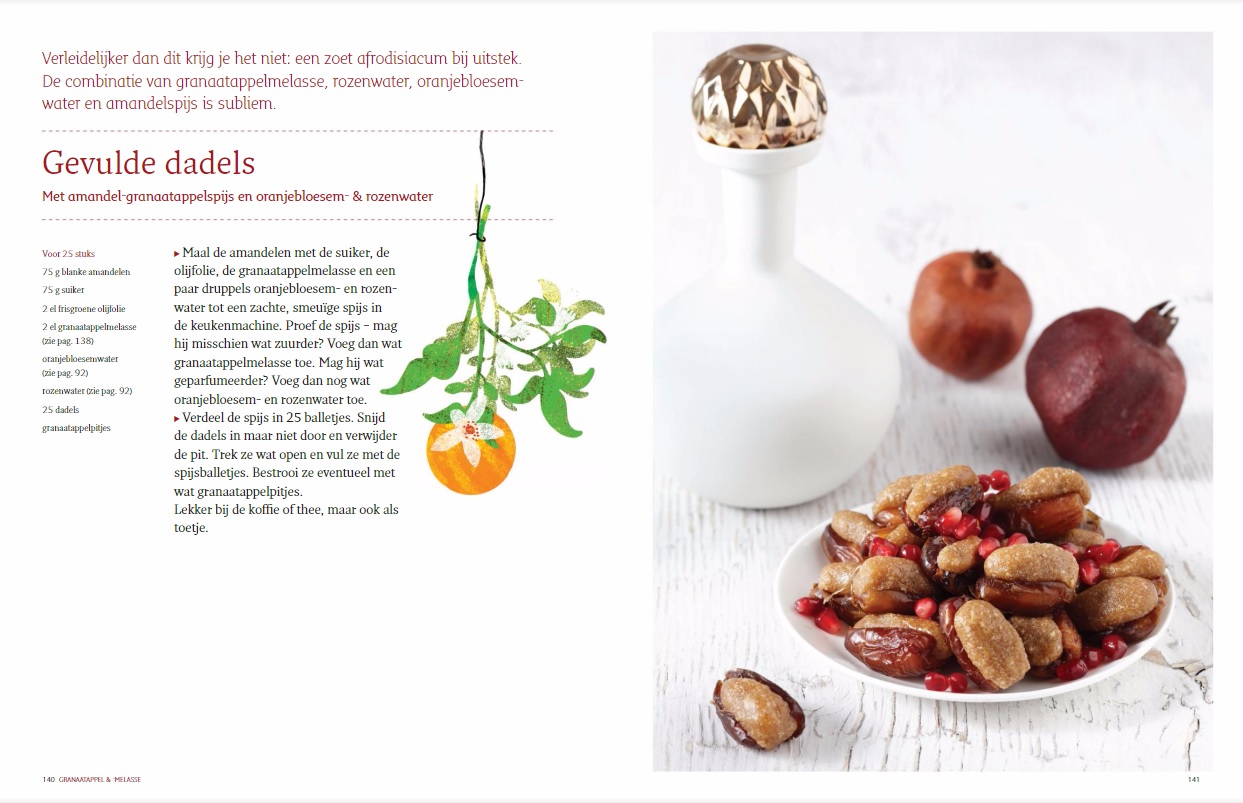Over dit recept schrijven ze: “Verleidelijker dan dit krijg je het niet: een zoet afrodisiacum bij uitstek. De combinatie van granaatappelmelasse, rozenwater, oranjebloesemwater en amandelspijs is subliem.”