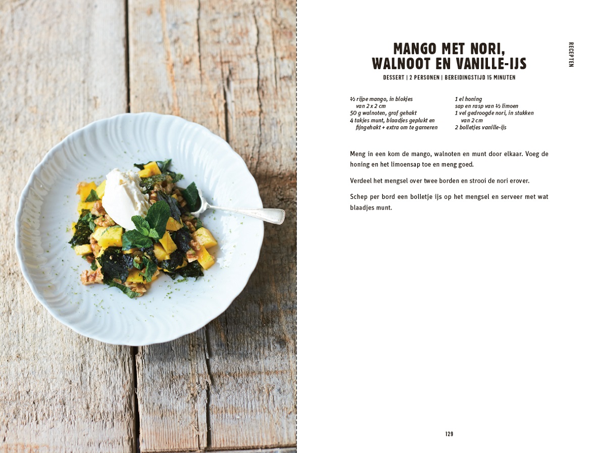 Het recept voor deze mango met nori, walnoot en vanille-ijs komt uit het boek Koken met zeewier en zilte groente van ‘Toine de Zeewierman’ Toine Wilke.