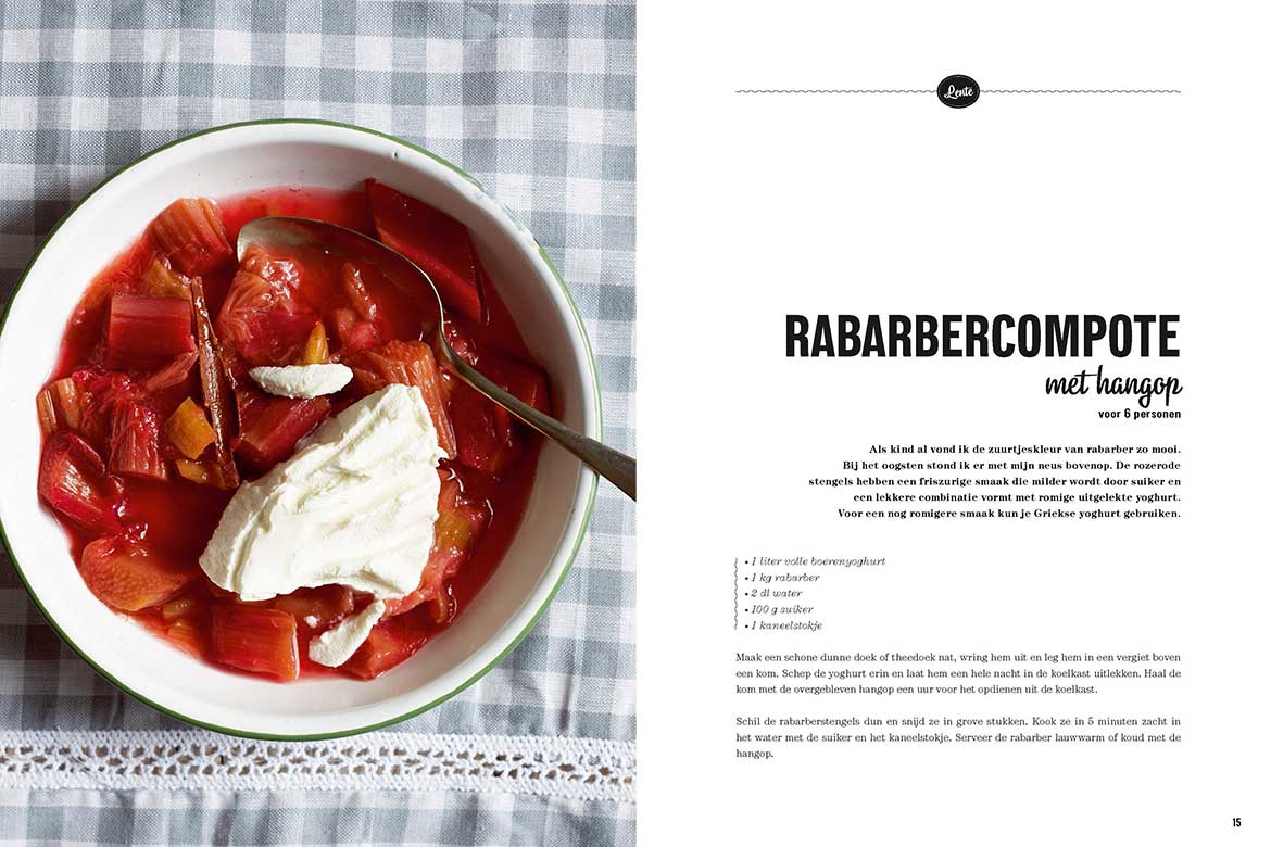 Rabarber is een vaste plant die elk jaar vanzelf weer opkomt. Over dit recept, uit het hoofdstuk Lente, schrijft Manja: “Als kind al vond ik de zuurtjeskleur van rabarber zo mooi. Bij het oogsten stond ik er met mijn neus bovenop. De rozerode stengels hebben een friszurige smaak die milder wordt door suiker en een lekkere combinatie vormt met romige uitgelekte yoghurt. Voor een nog romigere smaak kun je Griekse yoghurt gebruiken.”
