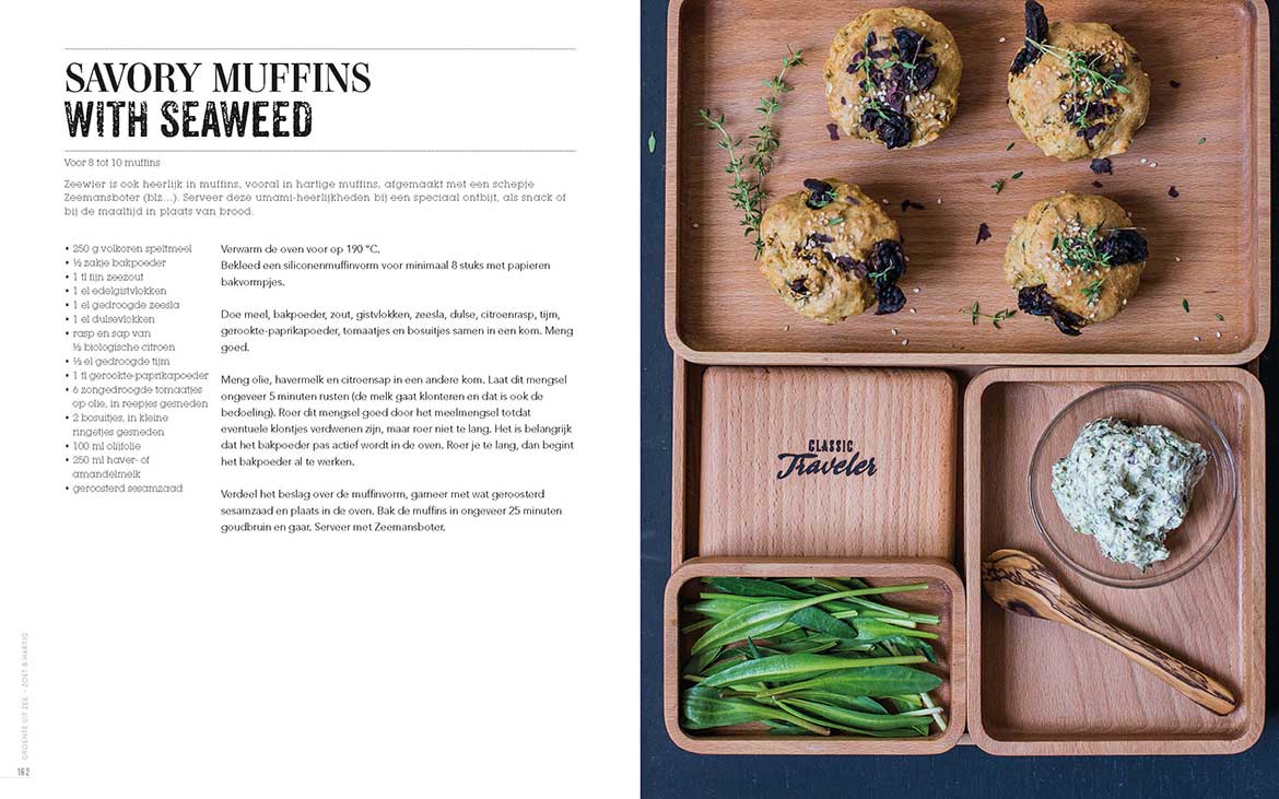 Over dit recept in het boek: “Zeewier is ook heerlijk in muffins, vooral in hartige muffins, afgemaakt met een schepje Zeemansboter (recept in het boek). Serveer deze umami-heerlijkheden bij een speciaal ontbijt, als snack of bij de maaltijd in plaats van brood.”