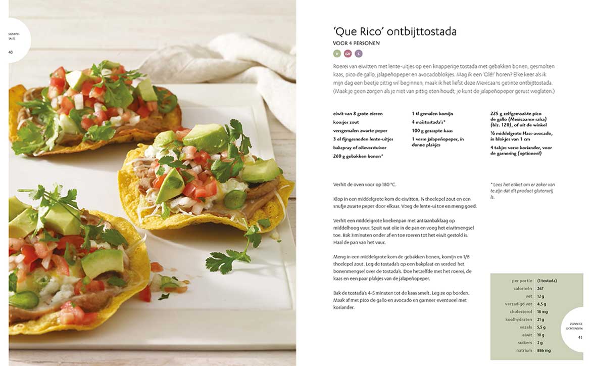 Ze schrijft erover: “Roerei van eiwitten met lente-uitjes op een knapperige tostada met gebakken bonen, gesmolten kaas, pico de gallo, jalapeñopeper en avocadoblokjes. Mag ik een ‘Olé!’ horen? Elke keer als ik mijn dag een beetje pittig wil beginnen, maak ik het liefst deze Mexicaans getinte ontbijttostada.”