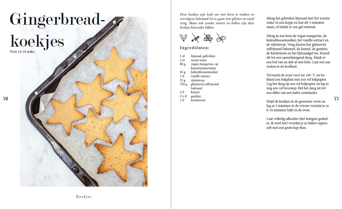 Over dit recept in het boek: “Deze koekjes zijn leuk om met kerst te maken en vervolgens helemaal los te gaan met glitters en royal icing. Maar ook zonder toeters en bellen zijn deze koekjes bijzonder lekker.”