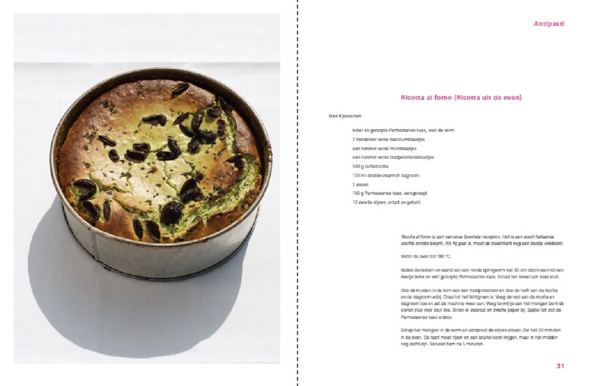 Over dit recept schrijven de auteurs: “Ricotta al forno is een van onze favoriete recepten. Het is een soort Italiaanse soufflé zonder bloem. Als hij gaar is, moet de bovenkant nog een beetje wiebelen.”