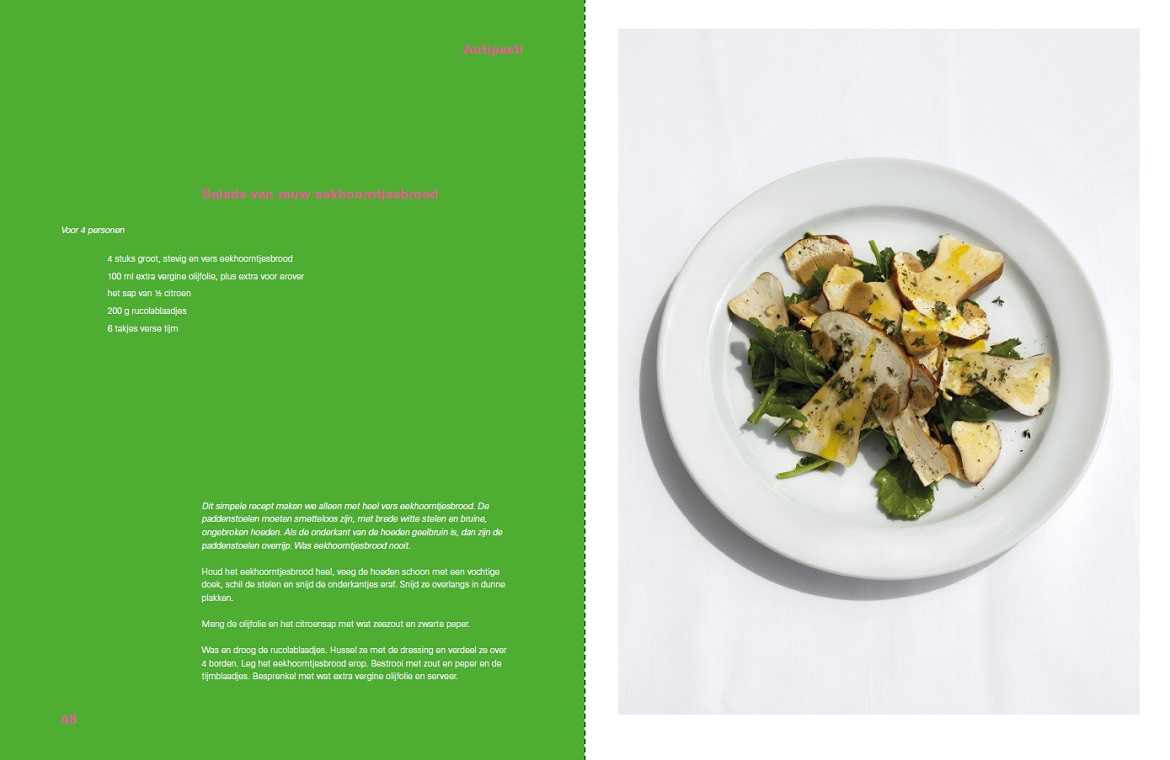 Uit het boek over dit recept: “Dit simpele recept maken we alleen met heel vers eekhoorntjesbrood. De paddenstoelen moeten smetteloos zijn, met brede witte stelen en bruine, ongebroken hoeden. Als de onderkant van de hoeden geelbruin is, dan zijn de paddenstoelen overrijp. Was eekhoorntjesbrood nooit.”