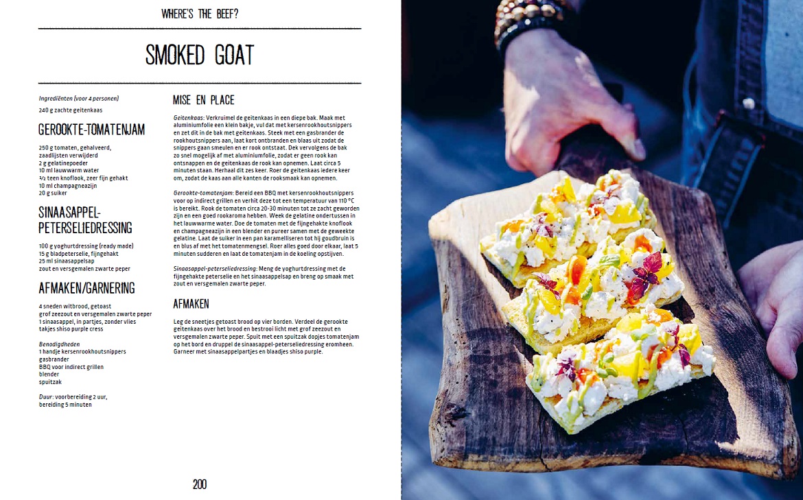 - GEITENKAAS Verkruimel de geitenkaas in een diepe bak. Maak met aluminiumfolie een klein bakje, vul dat met kersenrookhoutsnippers en zet dit in de bak met geitenkaas. Steek met een gasbrander de rookhoutsnippers aan, laat kort ontbranden en blaas uit zodat de snippers gaan smeulen en er rook ontstaat. Dek vervolgens de bak zo snel mogelijk af met aluminiumfolie, zodat er geen rook kan ontsnappen en de geitenkaas de rook kan opnemen. Laat circa 5 minuten staan. Herhaal dit zes keer. Roer de geitenkaas iedere keer om, zodat de kaas aan alle kanten de rooksmaak kan opnemen.