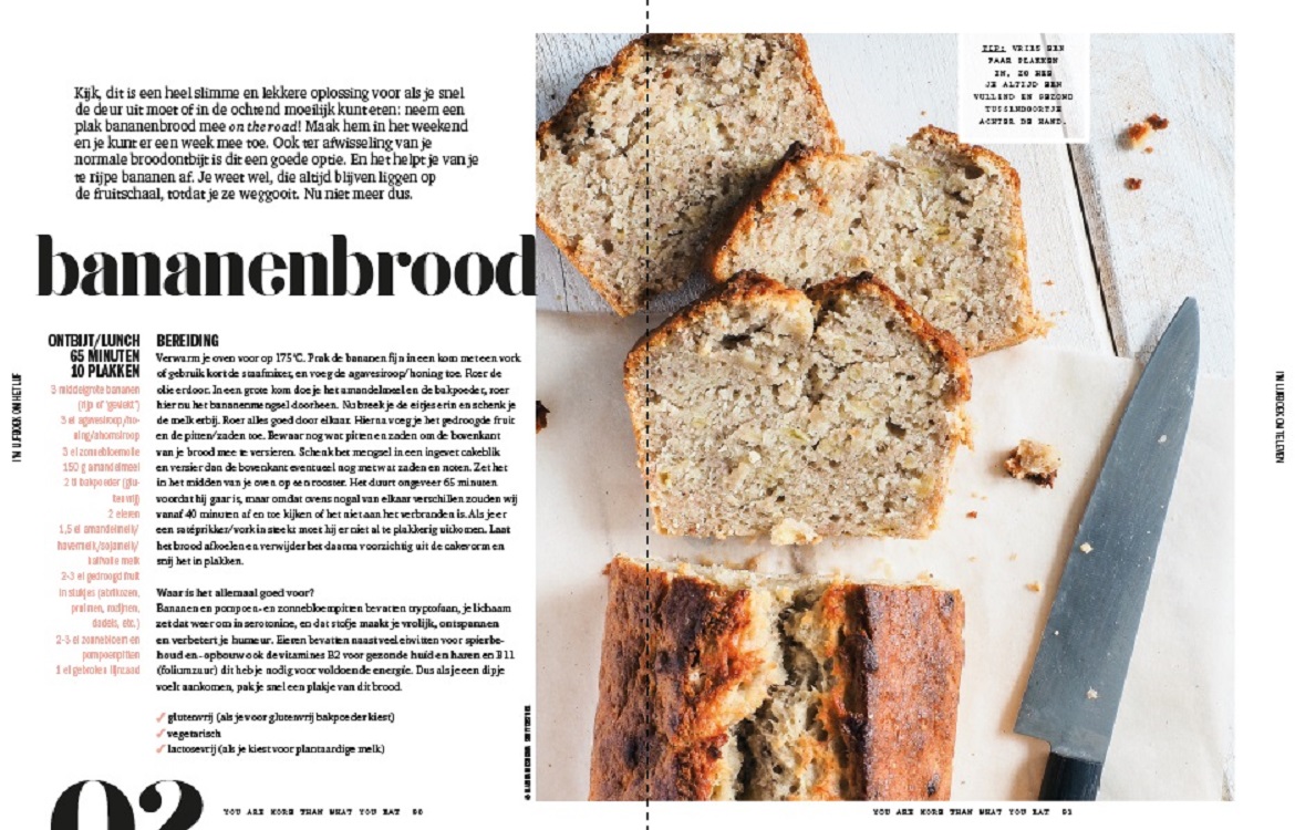 Over dit recept in het boek: “Kijk, dit is een heel slimme en lekkere oplossing voor als je snel de deur uit moet of in de ochtend moeilijk kunt eten: neem een plak bananenbrood mee on the road! Maak hem in het weekend en je kunt er een week mee toe. Ook ter afwisseling van je normale broodontbijt is dit een goede optie. En het helpt je van je te rijpe bananen af. Je weet wel, die altijd blijven liggen op de fruitschaal, totdat je ze weggooit. Nu niet meer dus.”