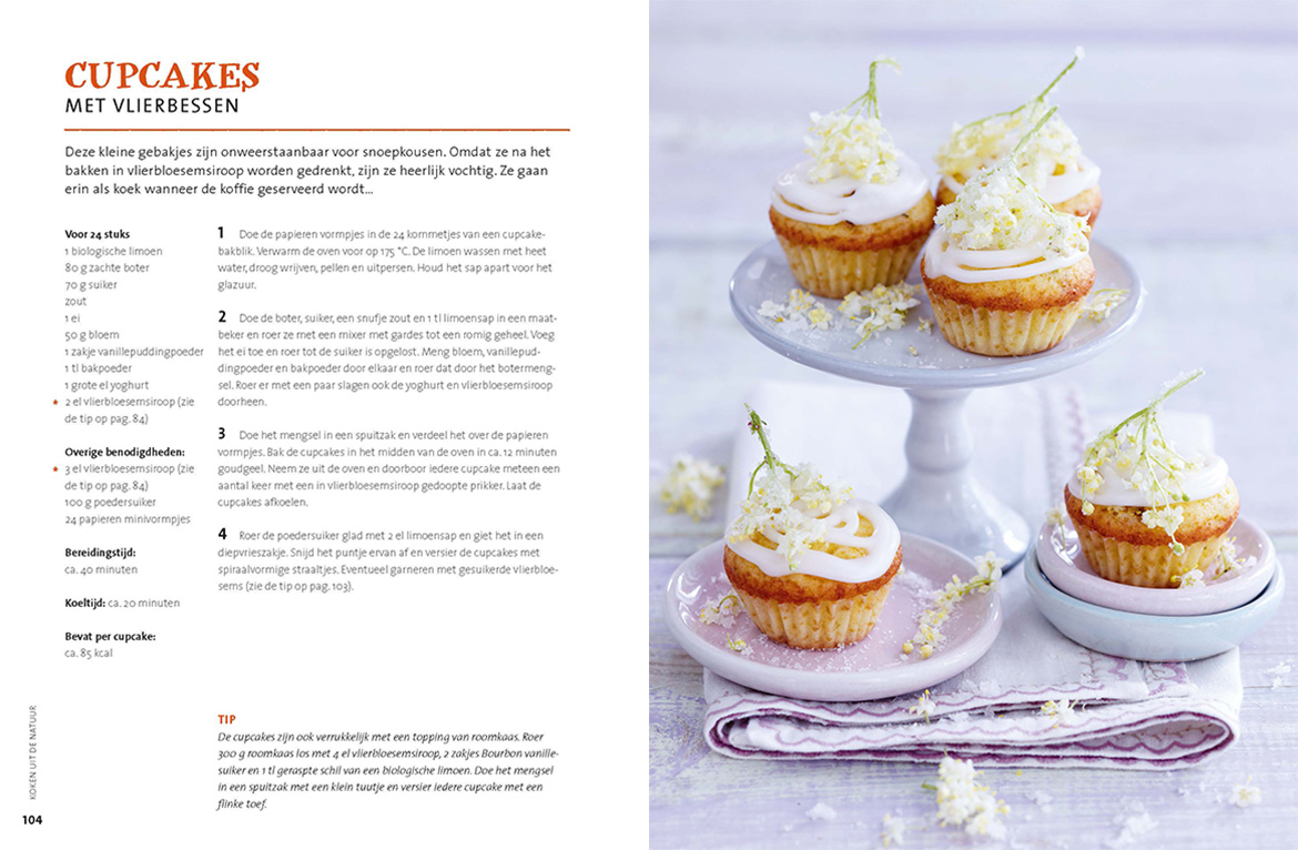 Dit recept voor cupcakes met vlierbessen komt uit het boek Koken uit de natuur van Diane Dittmer. In Koken uit de natuur geeft Diane Dittmer advies over wildplukken en gratis en gezond eten uit de natuur. Wat kun je veilig plukken en hoe verwerk je het daarna in je eten? Dit kookboek bevat naast beknopte informatie over wildplukken 66 eenvoudige recepten voor verrassende gerechten en drankjes met kruiden, paddenstoelen en vruchten uit de natuur. De recepten zijn geordend naar wat je per seizoen in bos en veld of zelfs in de berm kunt vinden.